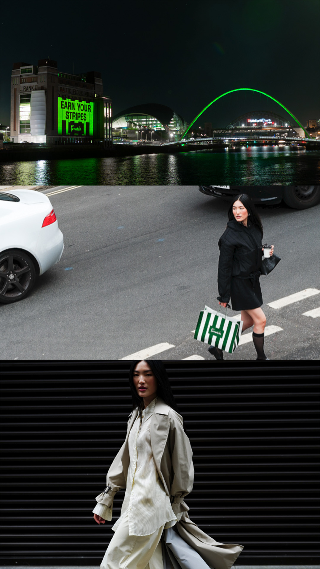 To mark the launch, Fenwick created a large-scale projection on the Baltic Centre for Contemporary Art in Newcastle on the evening of 9 September. The projection, featuring the Earn Your Stripes campaign creative, was accompanied by the illumination of the Millennium Bridge in Fenwick green, generating a striking visual across iconic landmarks in Fenwick’s place of origin in 1882.